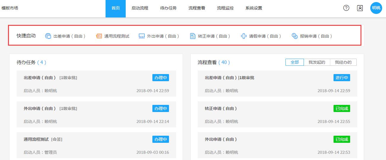 在首页上方有快捷启动栏,快捷启动栏显示的流程都是用户收藏或者经常使用的流程;