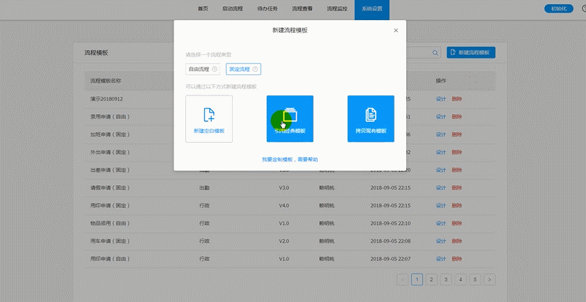 - 固定流程新建的时候有三种方式:新建空白流程、引用经典模板、拷贝现有模板;